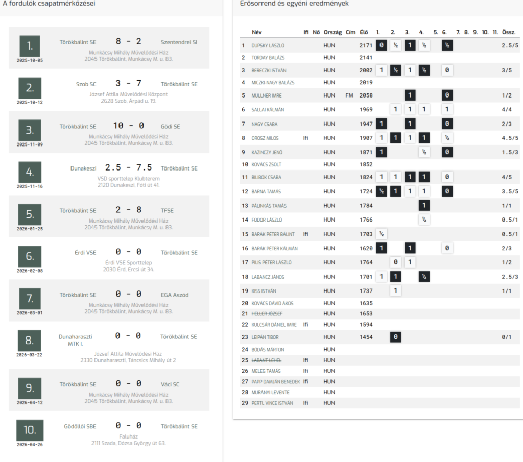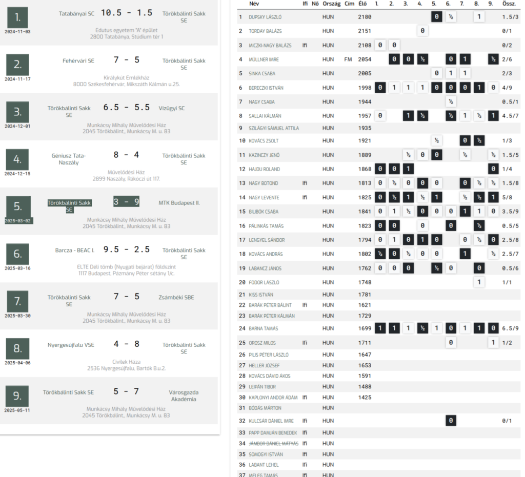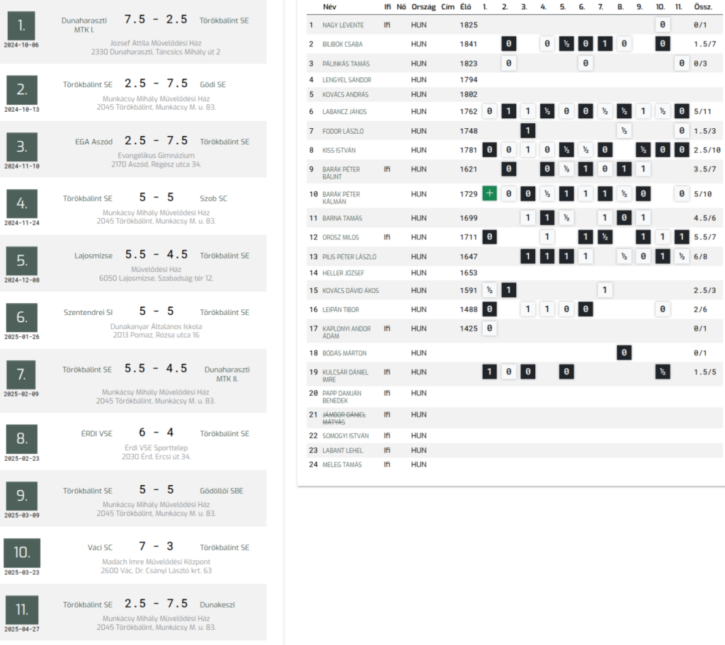 | 5 | Dunaharaszti II | 5 | 3,5 | 4 | 3 | * | 5 | 6 | 6 | 7,5 | 6,5 | 5 | 51,5 | 13 | 0 |