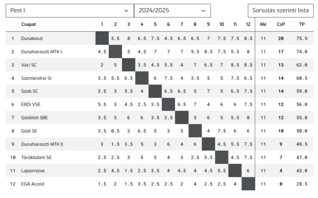 | 1 | Esztergomi SC | * | 4,5 | 6 | 8 | 10 | 7,5 | 11,5 | 9 | 10 | 10 | 9 | 15 | 76,5 |
